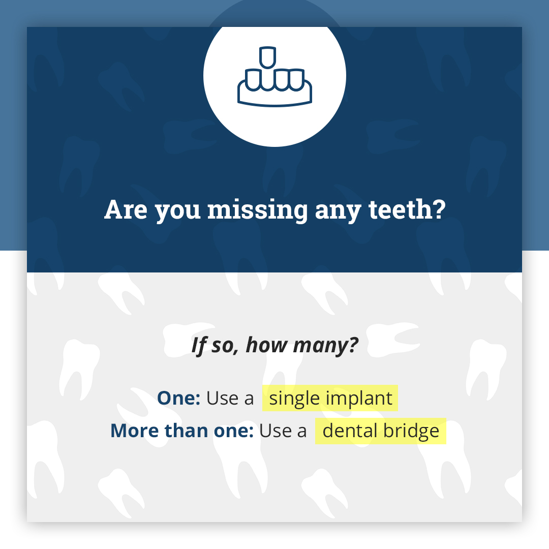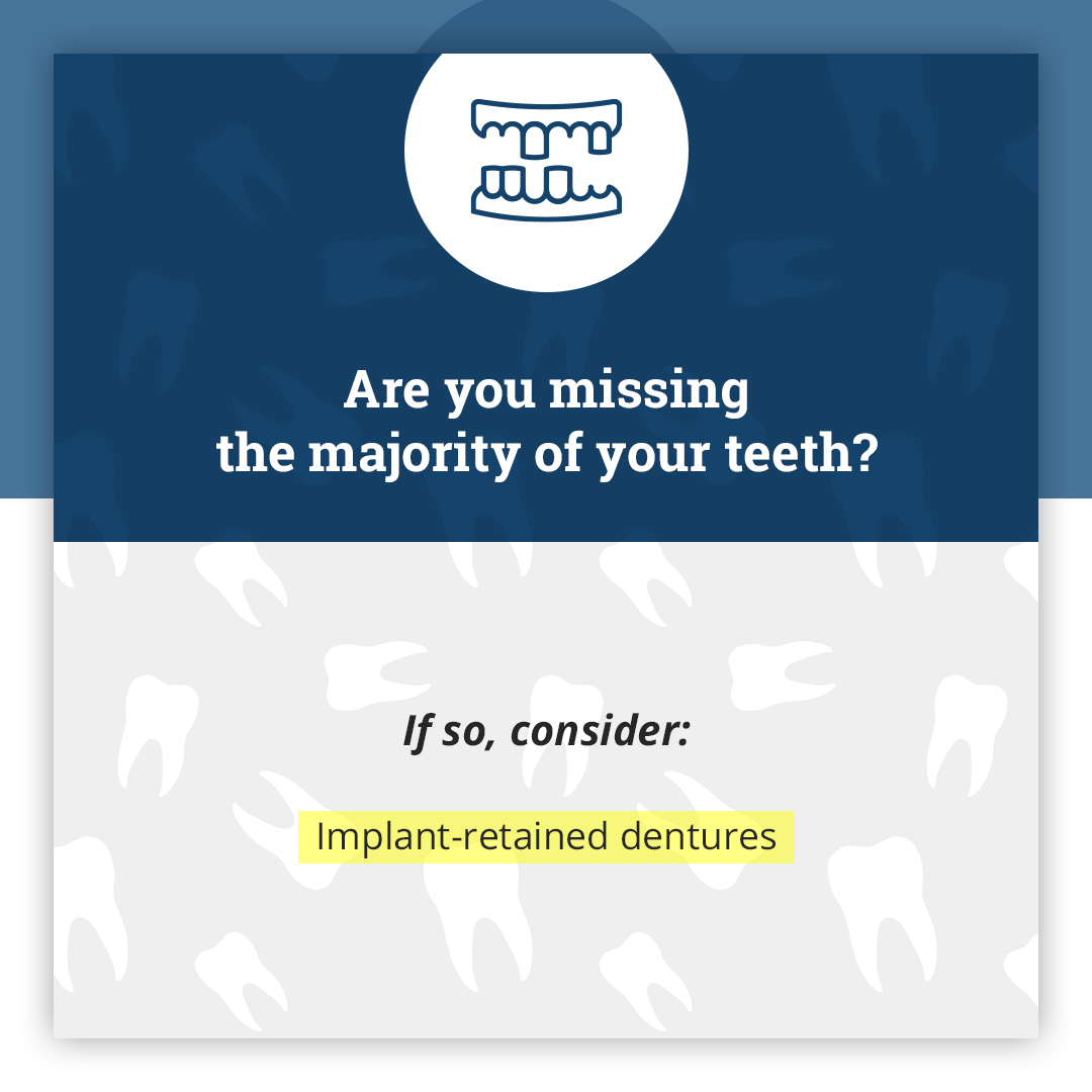 You can replace a single tooth, multiple teeth, or all your teeth with implants. You don’t even need one implant for every missing tooth. As few as two implants can support a removable lower denture, while as few as four implants can provide a full, permanent set of top or bottom teeth.