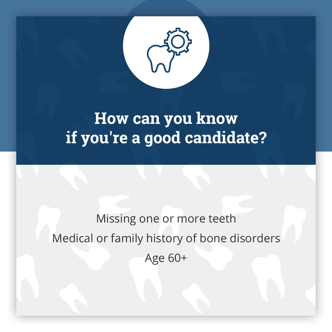 There’s a good chance that you are, but this can only be determined after a complete oral examination that includes x-rays of your jaws. Please schedule a consultation with our Baltimore dentistry to begin the exciting process of restoring your smile and bite force.
