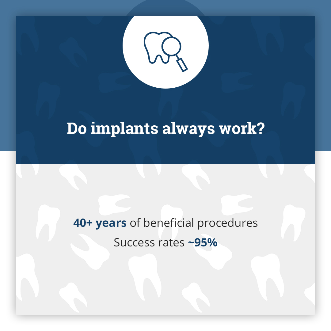 Strictly speaking, implants can’t be rejected because they contain no living cells or genetically coded material. The titanium of which they are made is completely biocompatible, and allergies are extremely rare. But an implant tooth can fail to integrate with the jawbone if an infection develops without practicing good oral hygiene, or if it is subjected to biting forces too soon. However, this is rare; implants regularly achieve success rates in excess of 95%.